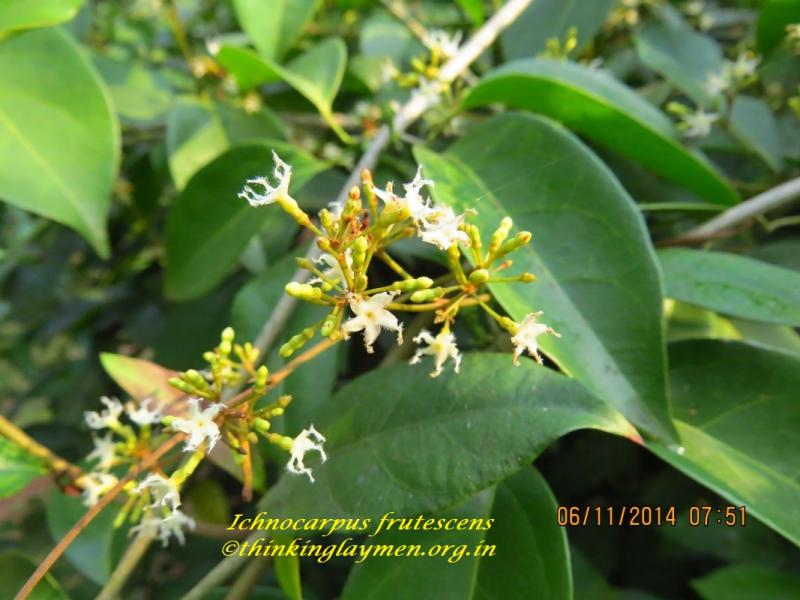 [ Synonyms : Aganosma affinis (Roem. & Schult.) G.Don ; Apocynum frutescens L.; Echites affinis Roem. & Schult.; Echites frutescens (L.) Roxb.; Echites malabaricus Lam.; Gardenia volubilis Lour.; Ichnocarpus affinis (Roem. & Schult.) K.Schum.; Ichnocarpus microcalyx Pit.; Ichnocarpus moluccanus Miq.; Ichnocarpus ovatifolius A. DC.; Ichnocarpus oxypetalus Pit.; Quirivelia frutescens (L.) M.R. Almeida & S.M. Almeida